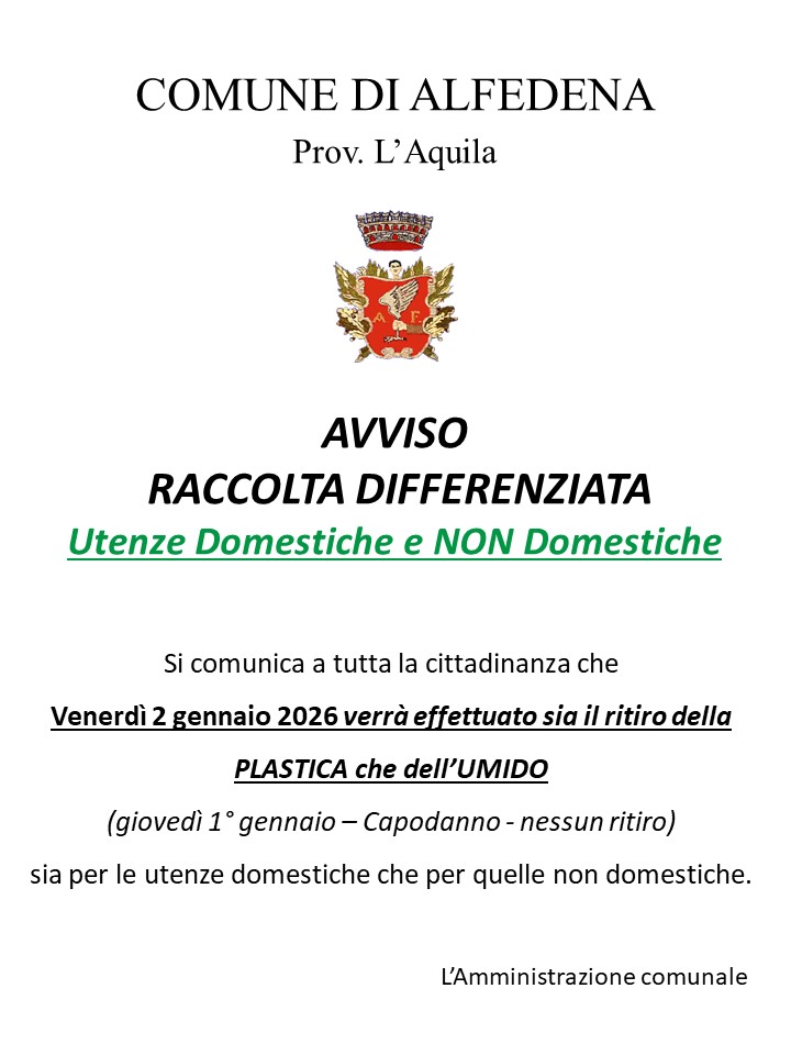 Venerdì 2 Gennaio 2026 verrà effettuato sia il ritiro della PLASTICA che dell'UMIDO,