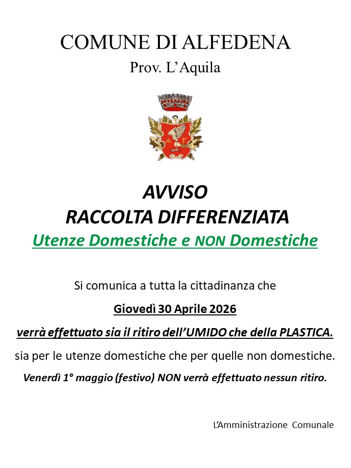 Venerdì 1° maggio (festivo) NON verrà effettuato nessun ritiro.