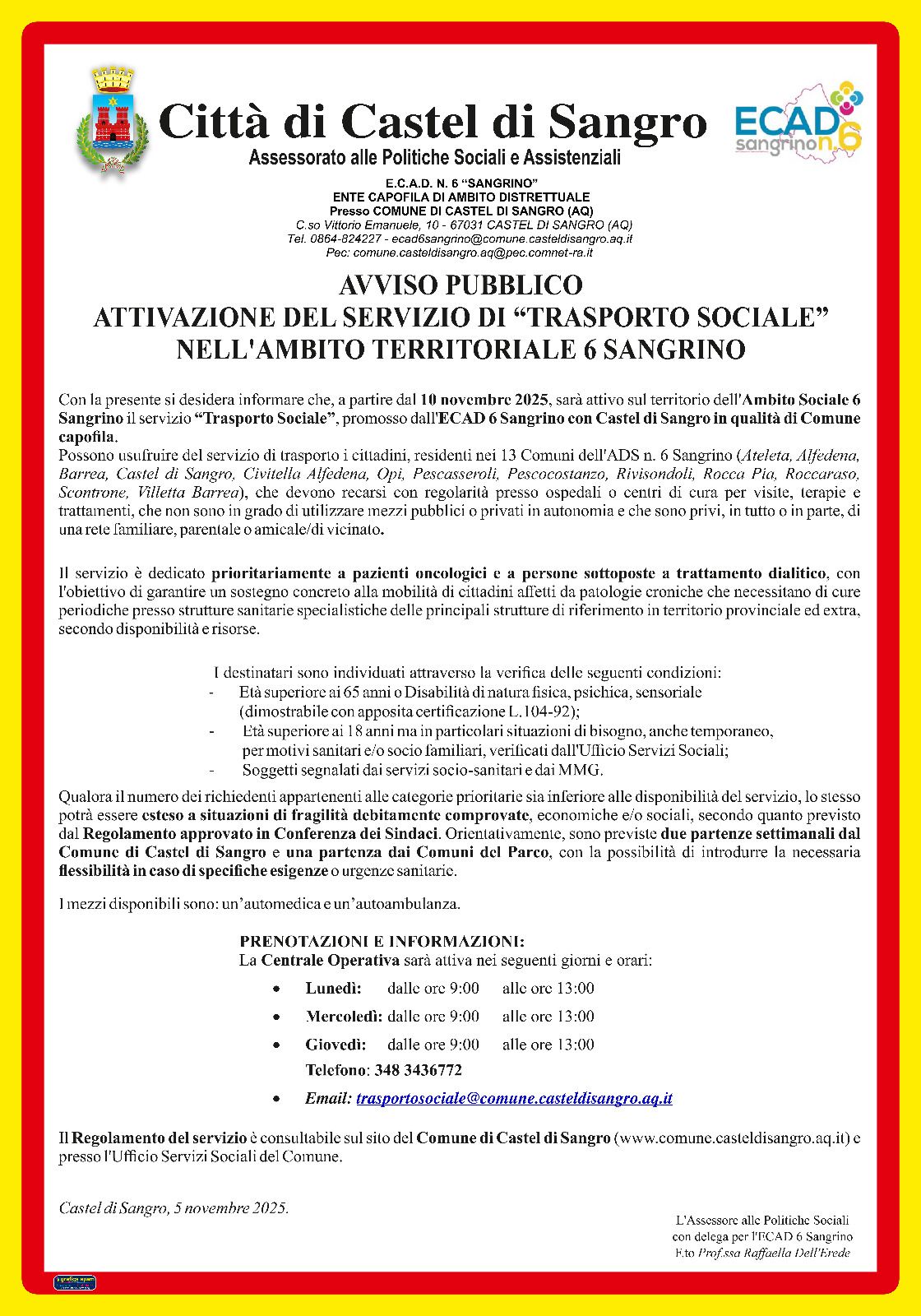 Si ricorda che, da lunedì 10 novembre, come già pubblicato in precedenza, è attivo il servizio di Trasporto Sociale per i comuni dell’ECAD Sangrino, compreso il Comune di Alfedena.